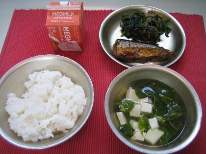 今日の給食はごはん・さんまの変わり煮・ほうれん草のおかか煮・菜の花のすまし汁でした。