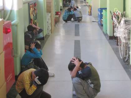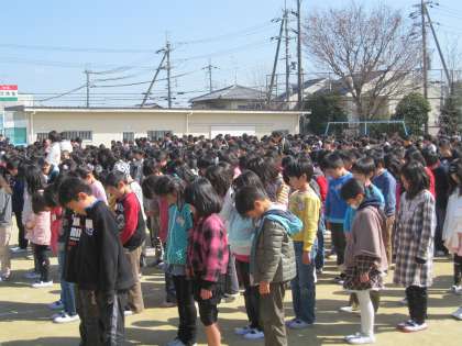 3月11日に避難訓練が行われました。今回は,地震が起こり,家庭科室より出火という設定で行いました。地震はいつどこで起きるか分かりません。その時その時のとっさの判断が生死を分けるということもあります。そこで,今回は授業中でなく,清掃時間に行いました。階段にいる子,トイレにいる子,中庭にいる子など,様々です。それぞれが放送を聞いて動かなければいけません。初めての試みだったのですが,全員無事に運動場に避難することができました。