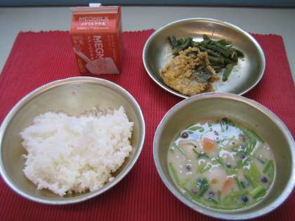 今日の給食はごはん・さわらの竜田揚げ・三度豆のごま煮・豆乳のみそ汁でした。