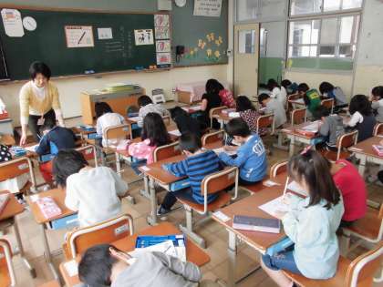 鉛筆の正しい持ち方をみんなで学習しました。人指し指と親指で鉛筆を持ち中指を枕にすると,覚えました。みんなで持っているときは上手に持てるのですが,線を描きだすと崩れてくる人もいます。その都度声をかけて直しています。みんな一生懸命線を書きました。