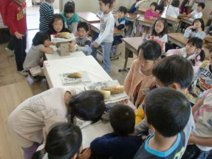 「皮に土がついているよ。」「皮が何枚もあるよ。」