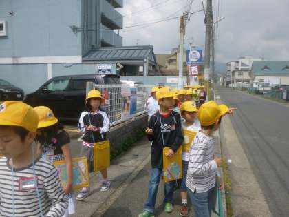 樫原のまちを4回に分けて歩きまわります。地図を新山陰街道と物集女街道で4つの区画に分けて、地図の目印になるものを探しながら歩きます。第一回目は小学校のある区画を大きく回りました。