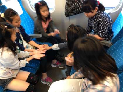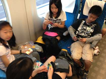新幹線の中では,トランプやウノを楽しんでいます。くつろいでいます。