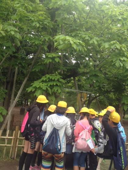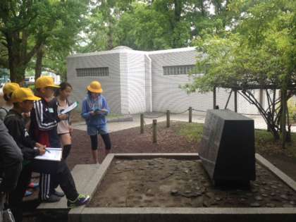 平和公園では,碑や像などをグループで巡っています。「峠三吉詩碑」「アオギリの木」などがありました。被曝しても生き残ったたくましいアオギリを見ることができました。
