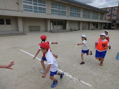 今,体育で6チームに分かれてリレーを楽しんでいます。