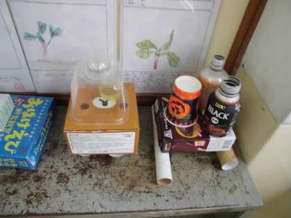 算数科の「いろいろなかたち」の学習で,空き箱や空き缶などを使って作りたいものを作る活動をしました。活動を通して自然と箱のような形や筒のような形のよさを生かして作り上げていました。工夫したところを発表し合う中で,「タイヤは丸くて転がるからこの丸い形をタイヤにしました。」「倒れにくいように大きい箱をタワーの土台にしました。」などと,それぞれの形の特徴をとらえて発表できました。