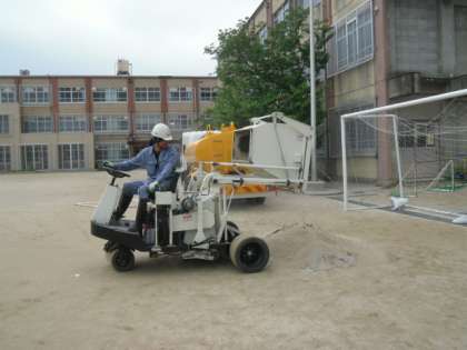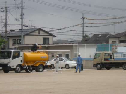 今日から運動場の改修工事が始まりました。運動場の砂埃を抑えるための工事です。