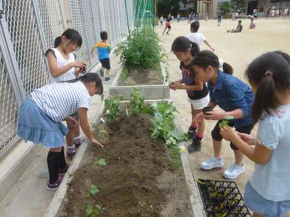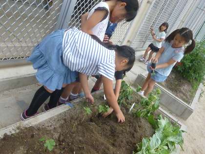 中間休みに、小さなポットで育てたオクラやヒマワリを、花だんに植えかえました。