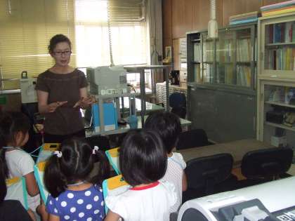2年生に連れて行ってもらった学校探検でもっと詳しく知りたいと思ったところをひとつ選び,今度は1年生だけで調べに行きました。先生に聞いてみたいことをインタビューしたり,お仕事の様子を見せていただいたりしました。普段はなかなかお話する機会の少ない先生にもお話を聞かせていただくことができました。初めてのインタビューで緊張した様子でしたが,聞きたかったことを聞くことができて満足そうな子ども達でした。なかなか入れない校長室や用務員室にも入らせてもらって興味津々な様子で中を見ていました。給食室では,大きなお鍋で給食を作っているところを見せていただき,子ども達は大きなお鍋や大きなおしゃもじに驚いていました。今までよりもまた少し学校のことがわかってうれしそうな子ども達でした。