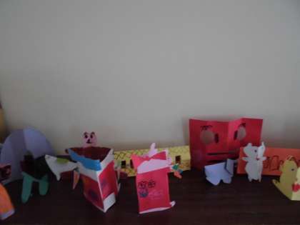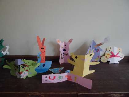 図画工作科の学習で,画用紙を折って立てていたらいいなと思う生き物やあったらいいなと思うものを考えて作りました。楽しく活動し,2つをつなげたり模様を工夫したりと意欲的に作っていました。
