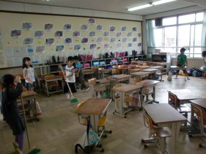 掃除時間の15分間。みんなで声をかけながら頑張って掃除しています。