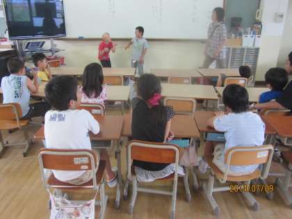 4年生がみさきの家から帰ってきました。かしのみ学級の皆も、どんなことをしたのか興味津々。4年生は、釣りやきもだめしなど、身振り手振りで教えてくれました。楽しかったことが伝わってきました。