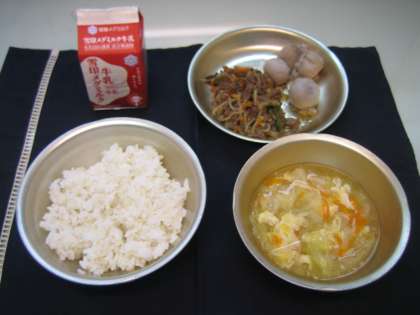 今日の給食は,麦ごはん・牛肉のしぐれ煮・里いもの煮つけ・キャベツのかきたま汁でした。