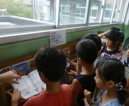音楽ホールからの帰りに、図書室の新刊を発見した児童たち。一瞬でむらがってしました。どんな本があるのかなー??