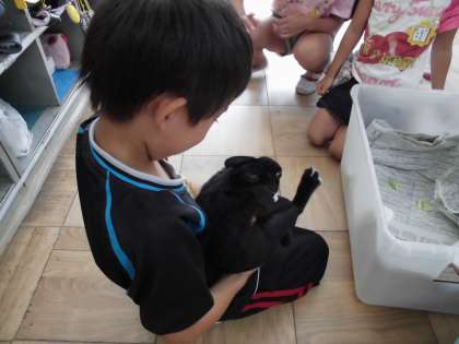 生活科の学習でウサギと触れ合いました。教科書を見て,「わたしたちもこんなんしたい!」と言っていたウサギとの触れ合いタイム。子どもたちは,どきどきわくわくしながらそろりと抱き上げたりびくびくしながら背中を触ったりしました。そして,「キャベツをあげようとしているのに食べてくれない。」「きっと緊張しているからだよ。」「耳が背中にぴったりくっついているよ。」「あったか〜い。」「ふわふわや。」と,気づいたことや思ったことを話していました。お昼休みは「先生,おしっこした!」と大騒ぎ。放課後は,ずっと見ていたい,触っていたいとウサギのそばを離れようとしない子どももいました。「明日は,何組からかな。」と,自分たちの教室にウサギが来てくれるのを楽しみにしている子どもたちです。