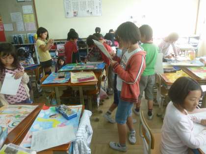 みんなのお話の絵を見ながら、お互いの絵の素敵なところを探しました。