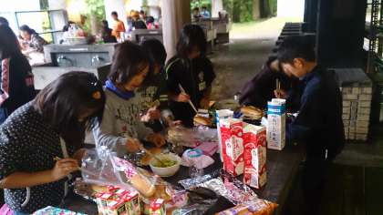 今日の朝食はパックドック。具を挟んだパンをアルミホイルで包み,牛乳パックに入れて火をつけます。パックが燃え尽きたら出来上がり,アルミホイルの中から出来立てアツアツのホットドックが現れました。