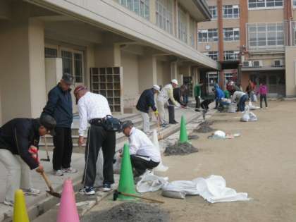 たくさんの地域の方々にご参加いただき,運動場の溝掃除を行いました。1年間で溜まった溝の砂がすっかりきれいになりました。