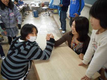 先生と腕相撲勝負中!!さて,勝てるかなー??