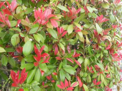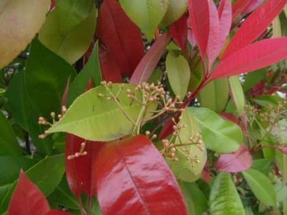 グリーンベルトの東端のベニカナメモチが色づき始めました。可愛いつぼみも付けています。もうじき,一面燃えるような紅色になります。