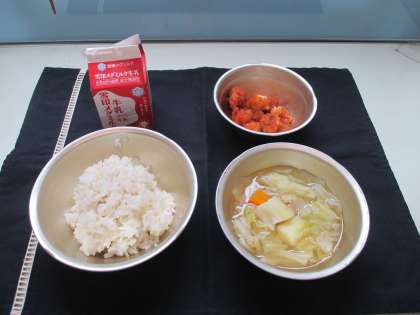 今日の給食は麦ごはん・たらのアングレス・春野菜のスープ煮・牛乳でした。