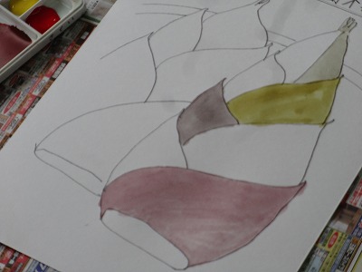 赤・青・黄の3色だけを使ってたけのこの色を塗りました。