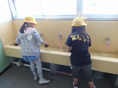 手洗い場で一生懸命掃除をしているキラリさん発見!