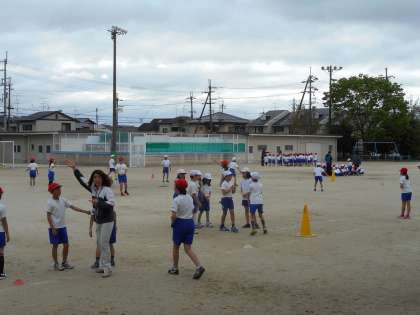 5年生はバトン渡しを練習しています。みんな一列になって,声をかけあっています。