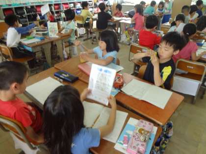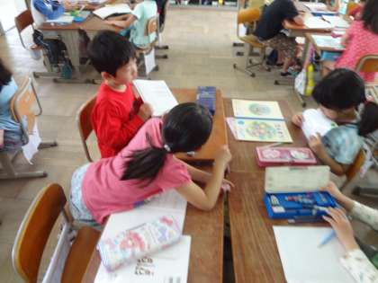 算数の学習で自分の考えたものを班のみんなに伝えることに挑戦しました。中には,質問したり,さらによい方法を考えたりしている班もありました。