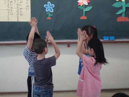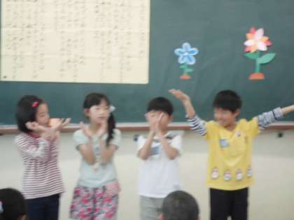 音楽の時間に「小さなはたけ」を歌い,グループで歌詞に合った動きを工夫して発表しました。手をつないでグループで一つの花を表現するところもあれば一人一人が手で表現するところもありました。また,高さで大きさを表現するところもあり,それぞれがグループで話し合ってどのような動きにするか考えた工夫が見られました。