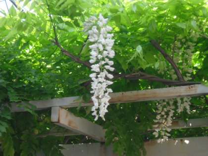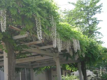 西門横の藤棚の藤の花が咲き始めました。