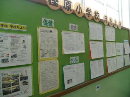 さて,本館西階段の踊り場に「樫原小学校月だより」のコーナーがあるのをご存知でしょうか?学校だよりや学年だよりの他に保健だよりや給食だより,小中連携として樫原中学校と松陽小学校の学校だよりも掲示しています。学校にお越しの折には,ぜひご覧ください。