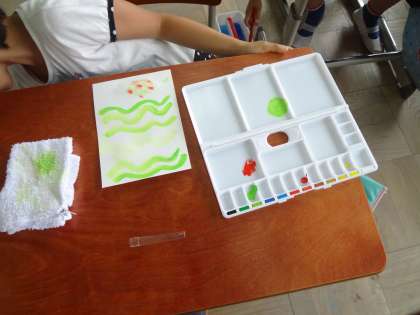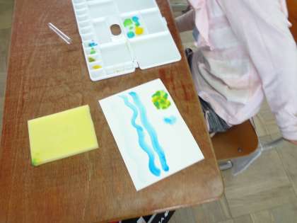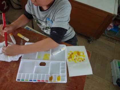 楽しみにしていた絵の具を使う学習が始まりました。好きな色を取り出して,濃い色や薄い色を作ったり,混ぜたりしました。
