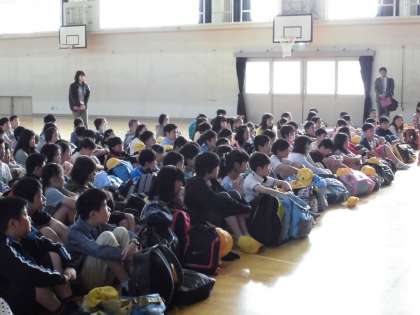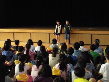 朝,体育館で出発式を行いました。校長先生からは「友情」をキーワードに,というお話がありました。