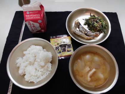 今日の給食は,ごはん・ししゃものからあげ・大根葉のごま炒め・いものこ汁・黒大豆・牛乳でした。