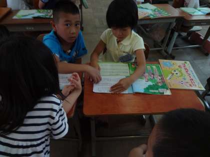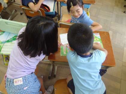 音楽「やまびこ ごっこ」では,自分たちで歌詞を考えて歌ってみることに挑戦しました。実際に発表すると聞いているみんながやまびこのように返してくれました。