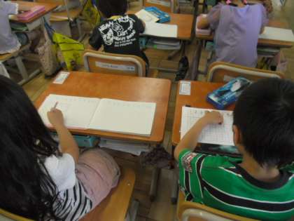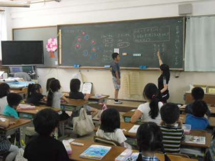 前に出て,自分の考えをしっかり発表しています。みんな静かに聞いています。ノートもきちんと書いています。