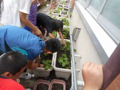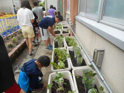 栽培委員会が,中庭に緑のカーテンの苗を植えたり種をまいたりしています。