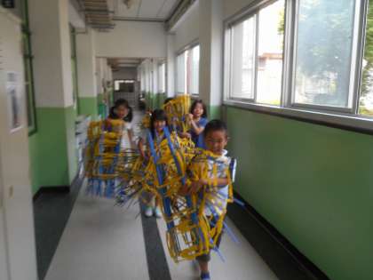 ろう下でたくさんのしちゅうを持った子どもたちに出会いました。