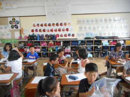 空気をビニール袋の中にとじこめて,感触を確かめました。