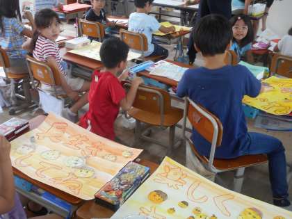 3年生は,ポスター作りをしています。いつもお世話になっているお年寄りの方に,気持ちをこめて,かいています。あたたかい色づかいに気をつけて,すてきなポスターができあがるといいな!