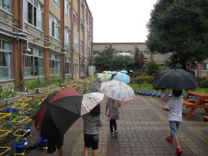 運動場や中庭で、雨の音を聞いたり、しずくのついたきらきらのくもの巣を見つけたり、
