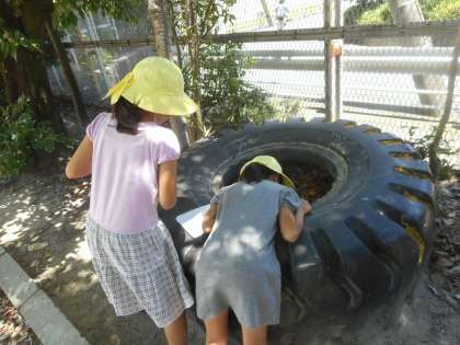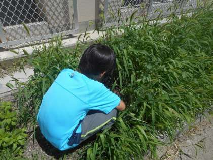 花壇や中庭,遊具のまわりなど,みんなで手わけして動物がいそうなところを調べました。