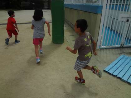 中間休みにみんな遊びをしました。青空の下で暑さにも負けずに走っていました。