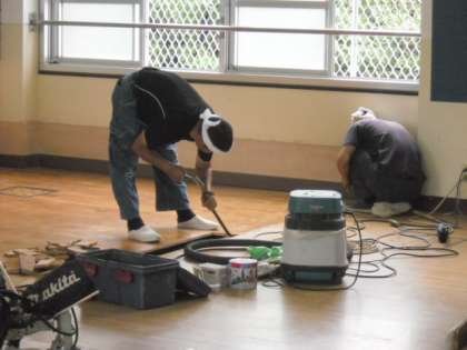 5月,かしのみ学級の畳を取った後の床に,少し段差ができていました。夏休みを利用して,その床の改修工事を行っています。子どもたちが登校するまでには,きれいな床に変身します。