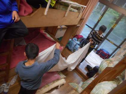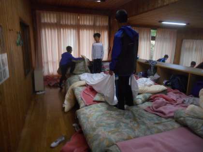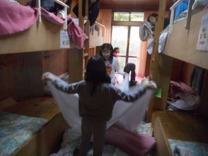 4日目の朝の様子です。協力して、シーツをたたんでいます。