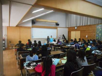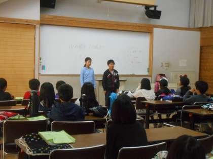 ふりかえりの内容を各班のリーダーと副リーダーが全体に発表している様子です。