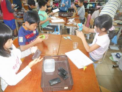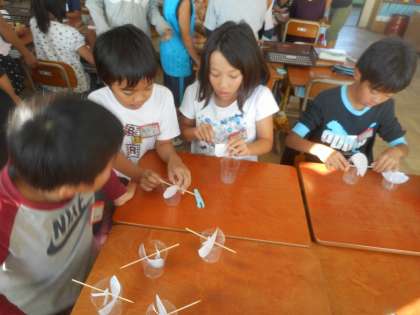 月の高度を調べるために,簡易の測定器を,プラスチックのコップと竹ひごを使って作りました。