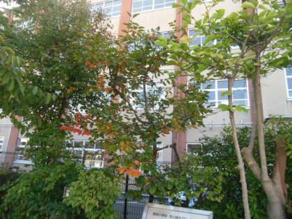 正門横の柿の木です。よく見るとたくさん実がなっています。秋の到来を感じます。