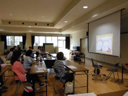 講師の稲元先生からは,子どもたちに向けてしていただいている歯みがき指導についての紹介や近年の子どもたちが抱える問題点などを写真や模型を用いて説明していただきました。むし歯は減少しているものの,食生活の変化で歯肉炎が増えていることやあごが発達する前に6歳臼歯が生えることによる歯並びの悪化など,さまざまな問題があるようです。5年生頃まで仕上げみがきが必要だとおっしゃっていたことに参加された保護者も驚いておられました。